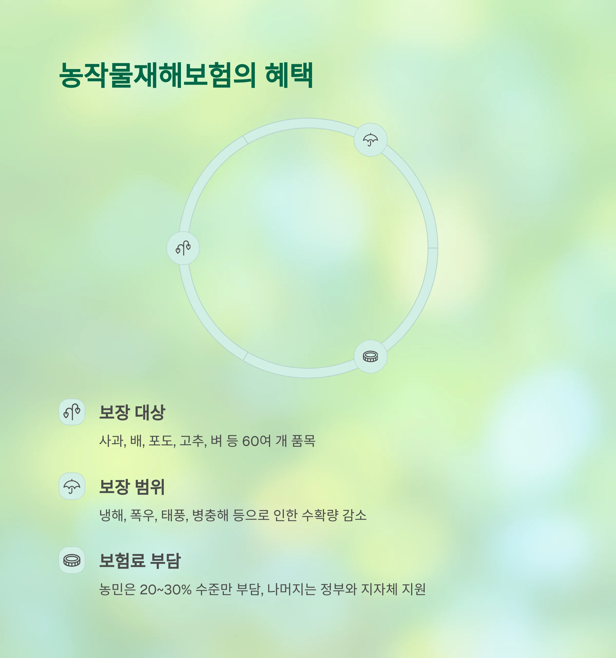 보장 범위 냉해, 폭우, 태풍, 병충해 등으로 인한 수확량 감소