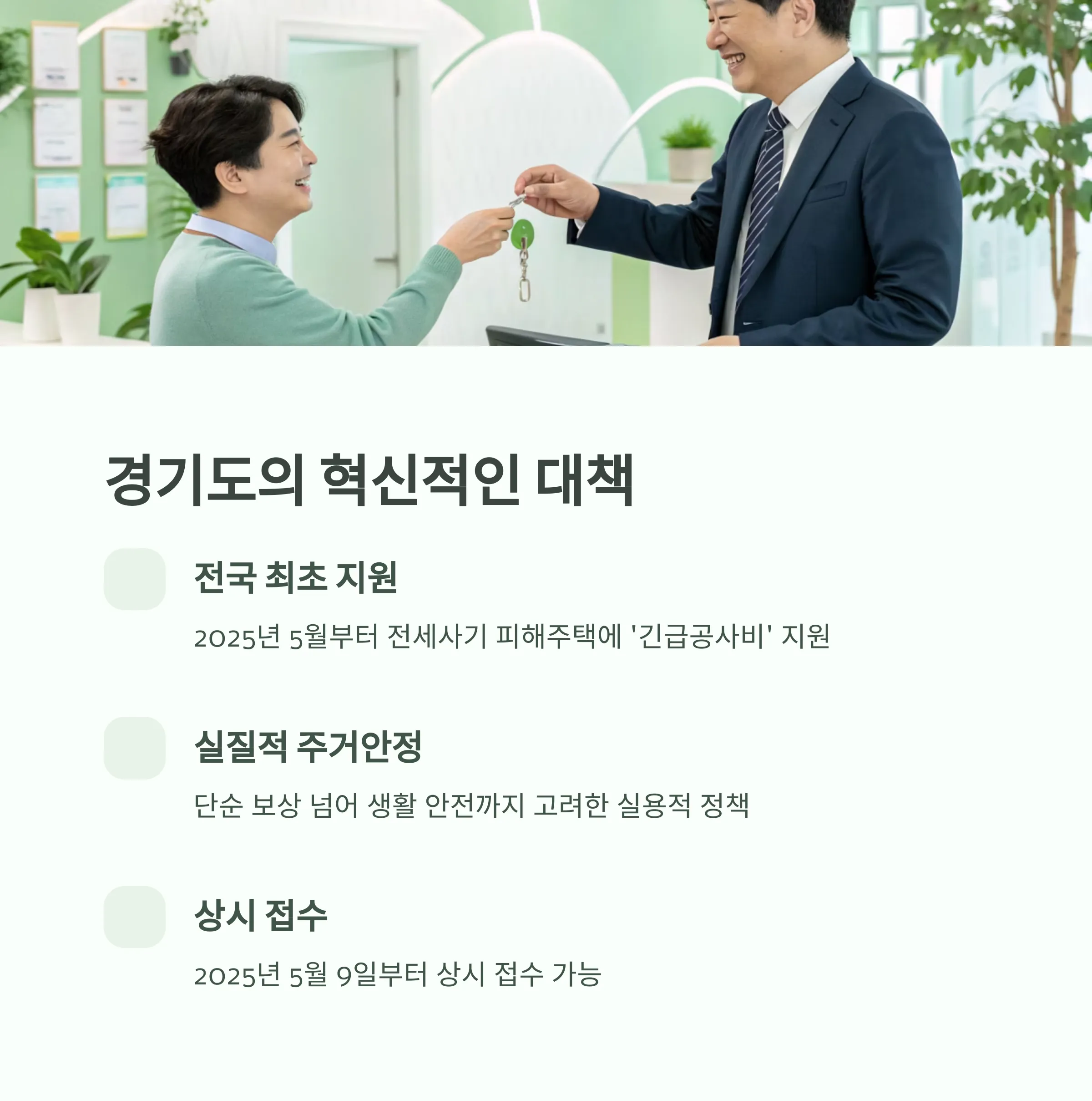 2025년 5월부터 경기도는 전국 최초로 전세사기 피해주택에 대해 ‘긴급공사비’를 지원합니다.