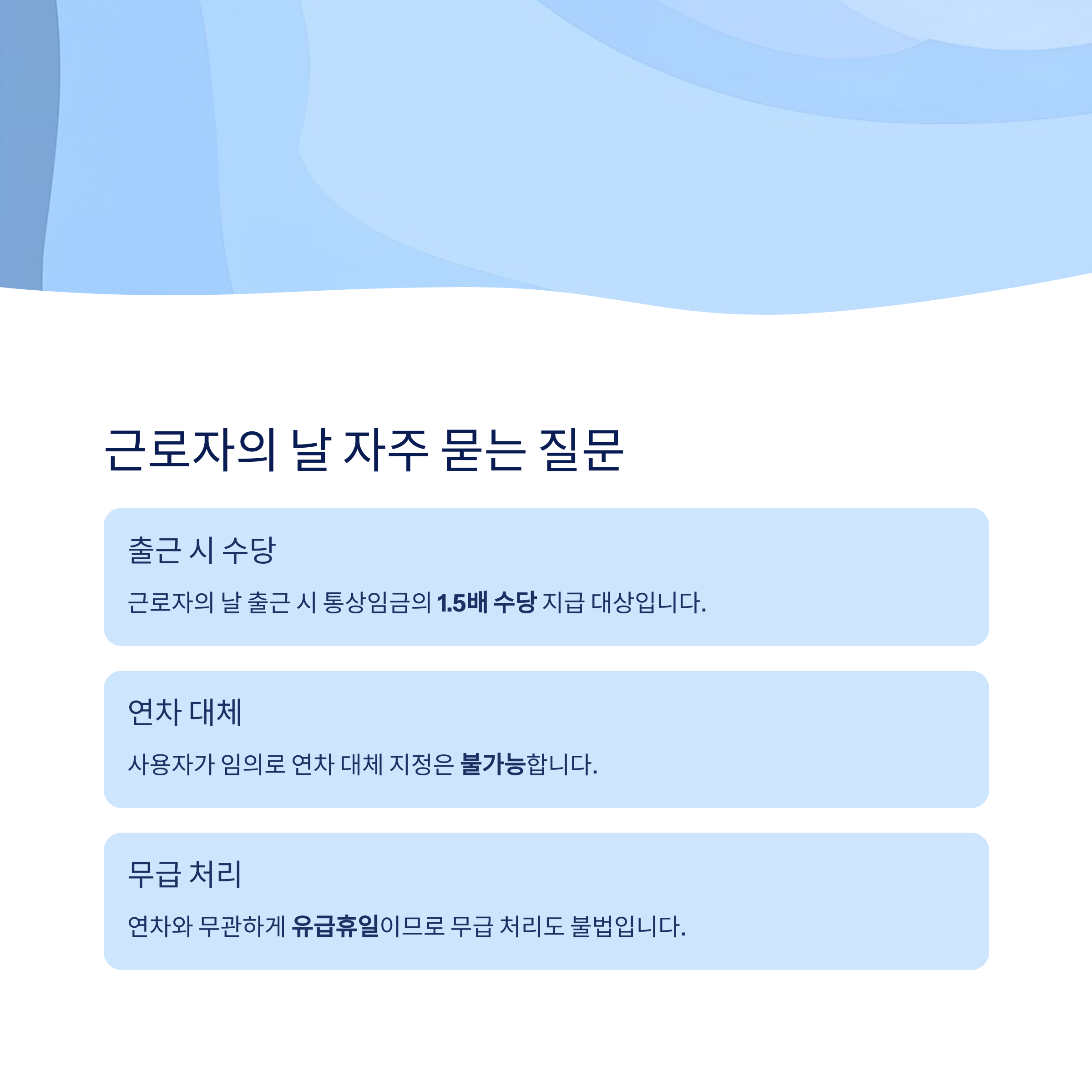 → 네. 유급휴일 근무이므로 통상임금의 1.5배 수당 지급 대상입니다. - Q. 연차로 대체하라고 하는데 괜찮은 건가요?