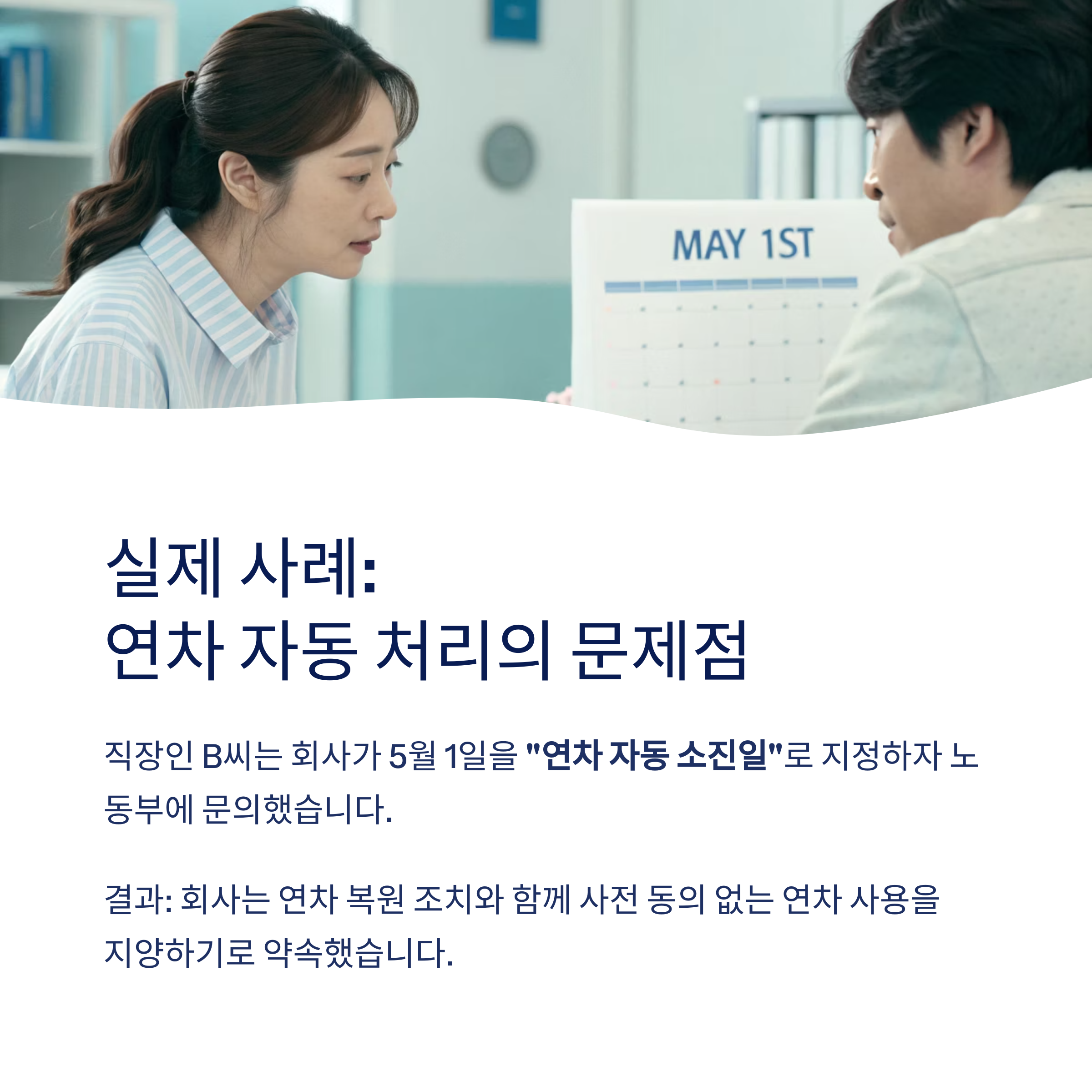 회사는 5월 1일을 **"연차 자동 소진일"**로 지정해 공지했습니다.
