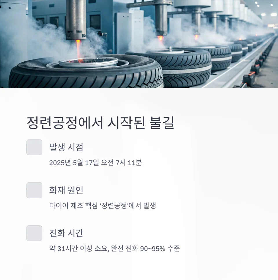 불은 타이어 제조의 핵심 단계인 '정련공정'에서 발생한 것으로 알려졌으며,