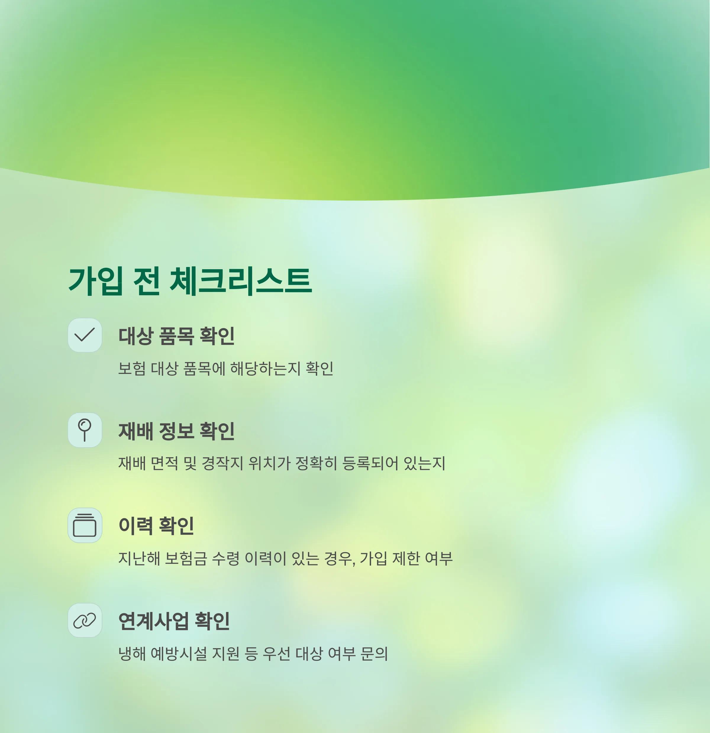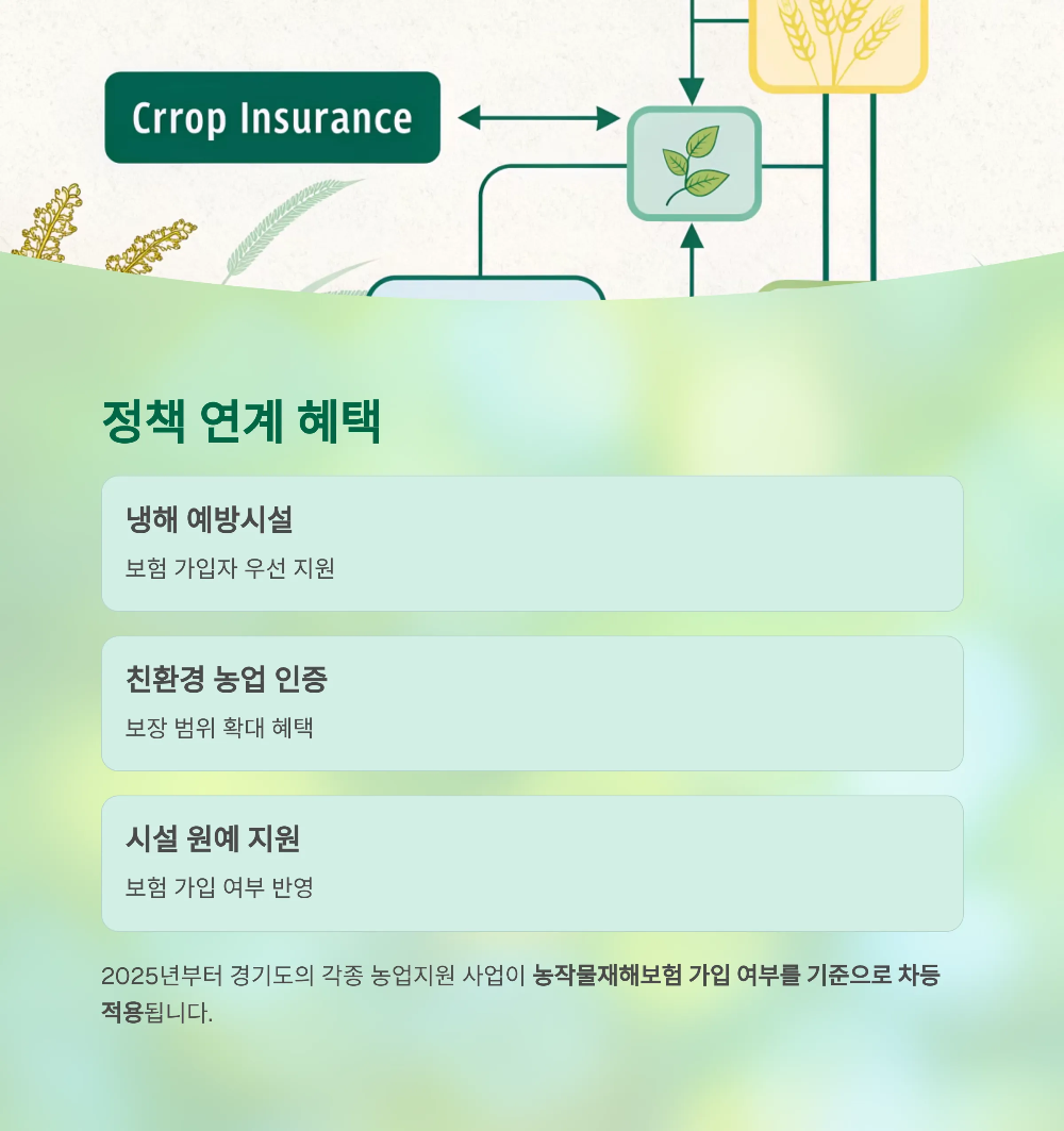 - 보험 가입 시 냉해 예방시설, 친환경 인증, 시설 농업 등 다양한 정책과 연계 혜택 가능
