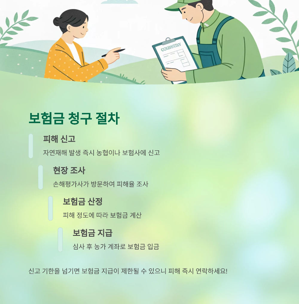 농가가 직접 보험사 또는 농협에 피해 사실을 신고해야 합니다.
