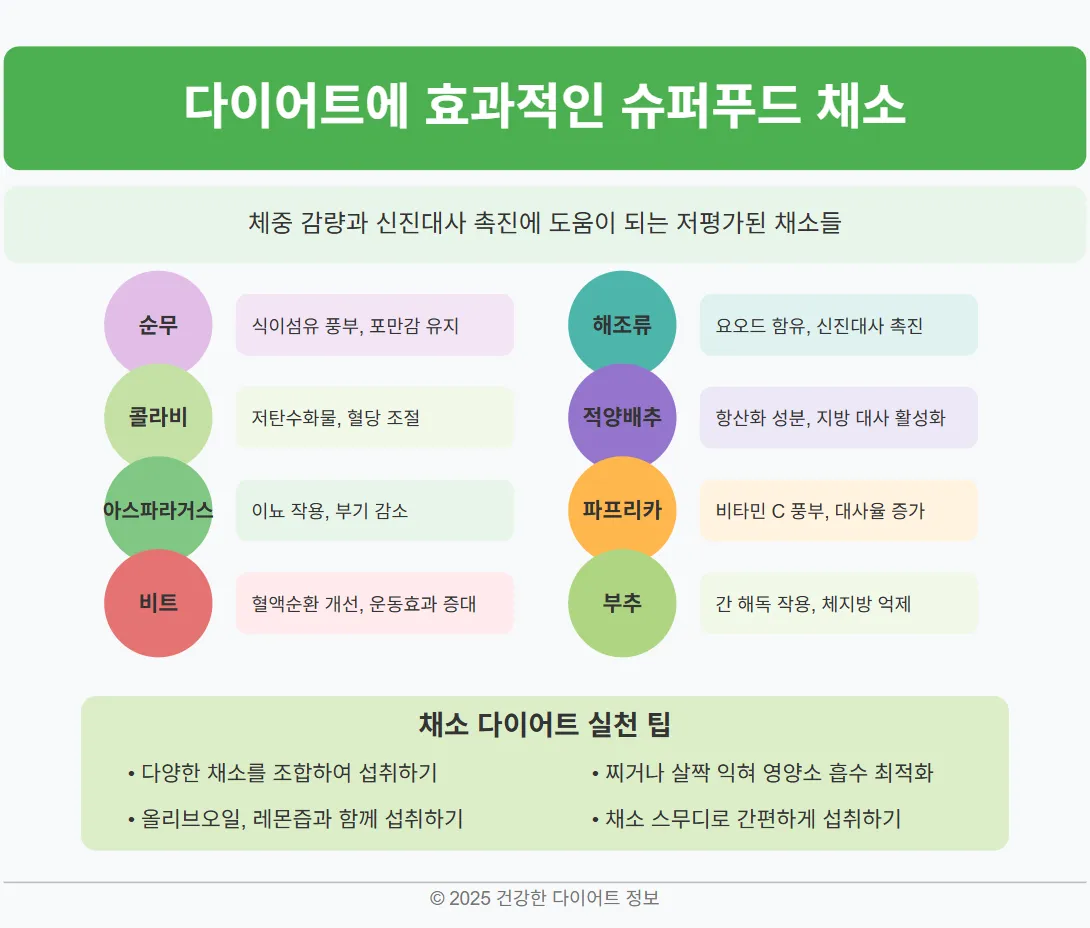 다이어트를 할 때 흔히 단백질과 저탄수화물 식단에 집중하지만, 채소의 중요성은 종종 간과됩니다. 하지만 채소는 단순히 칼로리가 낮은 식품이 아니라 체지방 감량과 신진대사 촉진에 중요한 역할을 합니다. 특히 우리가 잘 알지 못했던 몇몇 채소들은 다이어트에 뛰어난 효과를 발휘하며, 다양한 건강상의 이점을 제공합니다. 이번 글에서는 다이어트에 효과적인데도 상대적으로 주목받지 못한 슈퍼푸드 채소들을 소개하고, 그 영양적 장점과 활용법을 알아보겠습니다.