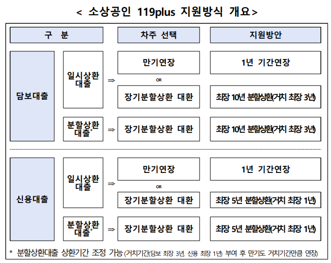 | 신용 일시상환 | 1년 만기연장 | 최대 5년 분할상환 (거치 1년 포함 가능) |