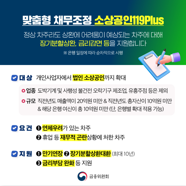 '소상공인 119plus'는 기존 ‘개인사업자대출119’보다 적용 대상을 넓히고 지원 내용도 강화한 맞춤형 채무조정 제도입니다.