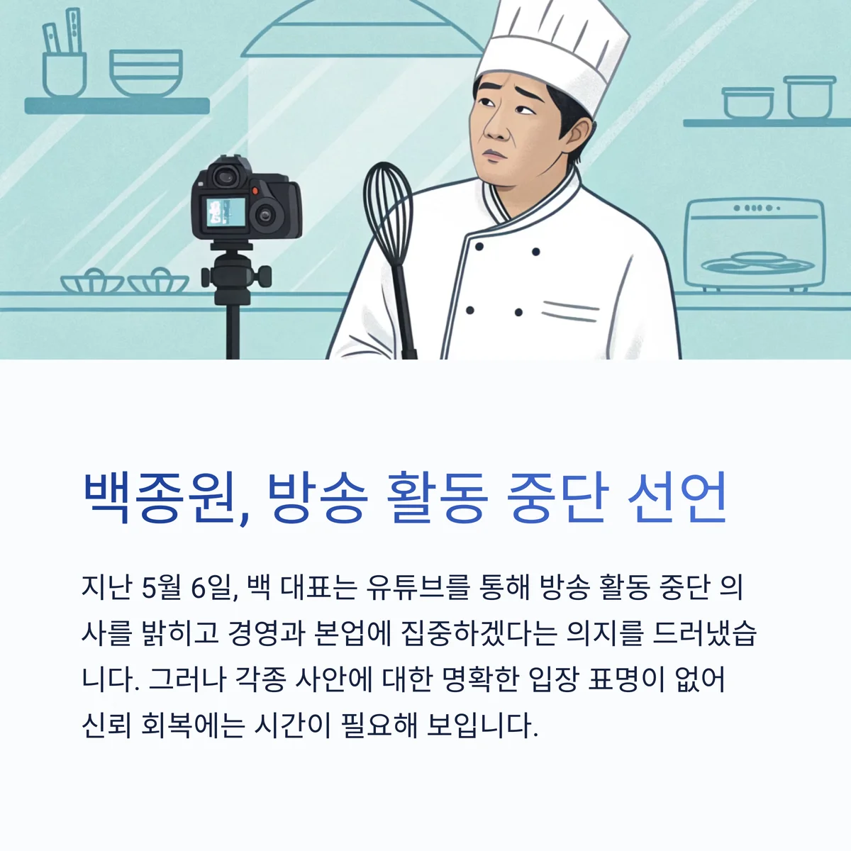지난 5월 6일, 백 대표는 유튜브를 통해 방송 활동 중단 의사를 밝혔으며