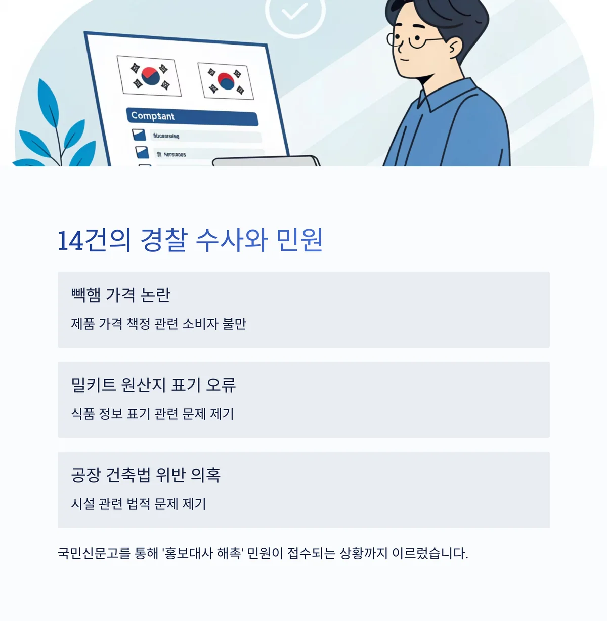 총 14건에 달하는 경찰 수사와 식약처 민원 접수가 이루어진 상태입니다.