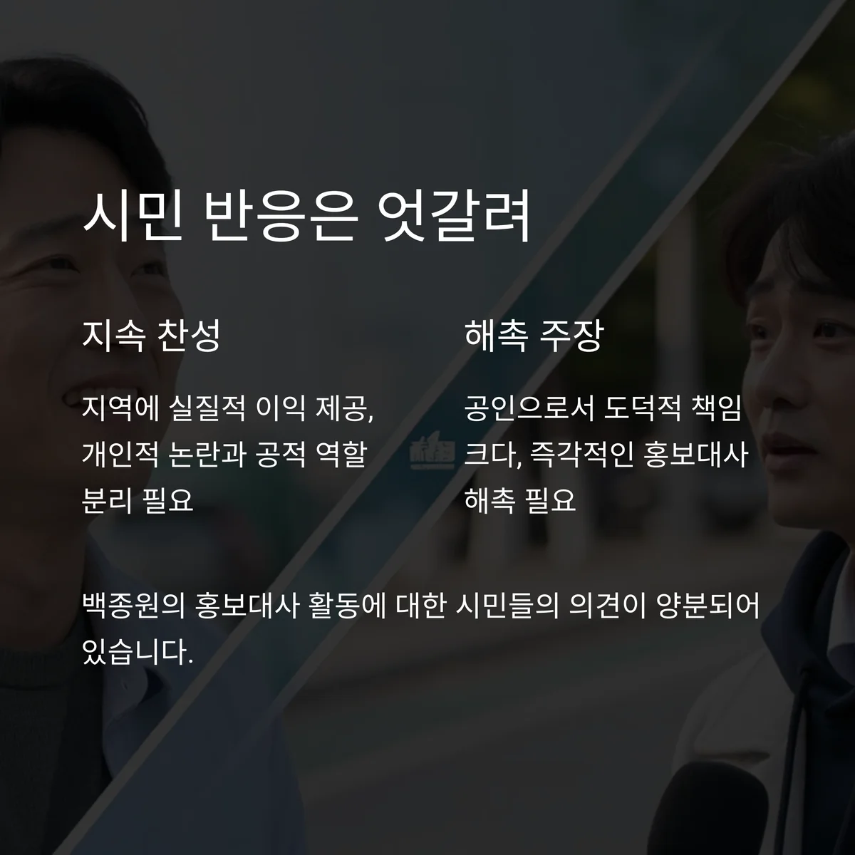 그의 지역 기여도와 현재 진행 중인 논란을 균형 있게 살피며