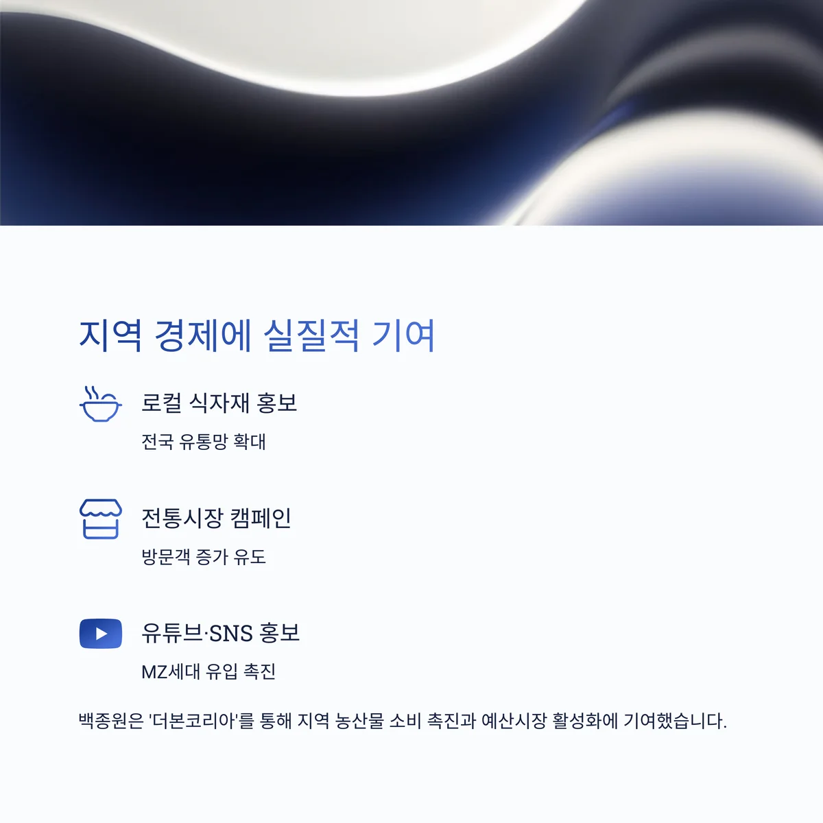 그는 ‘더본코리아’를 통해 지역 농산물 소비 촉진, 예산시장 활성화 등 다방면에서 활동하며
