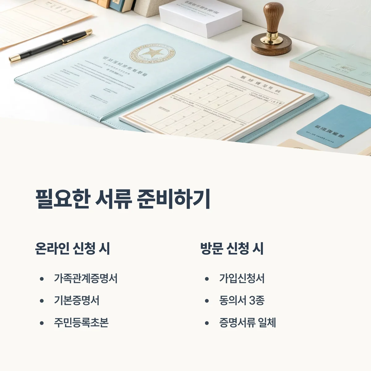 | 가족관계증명서 (주민번호 전체표기) | 가입신청서, 동의서 3종 |