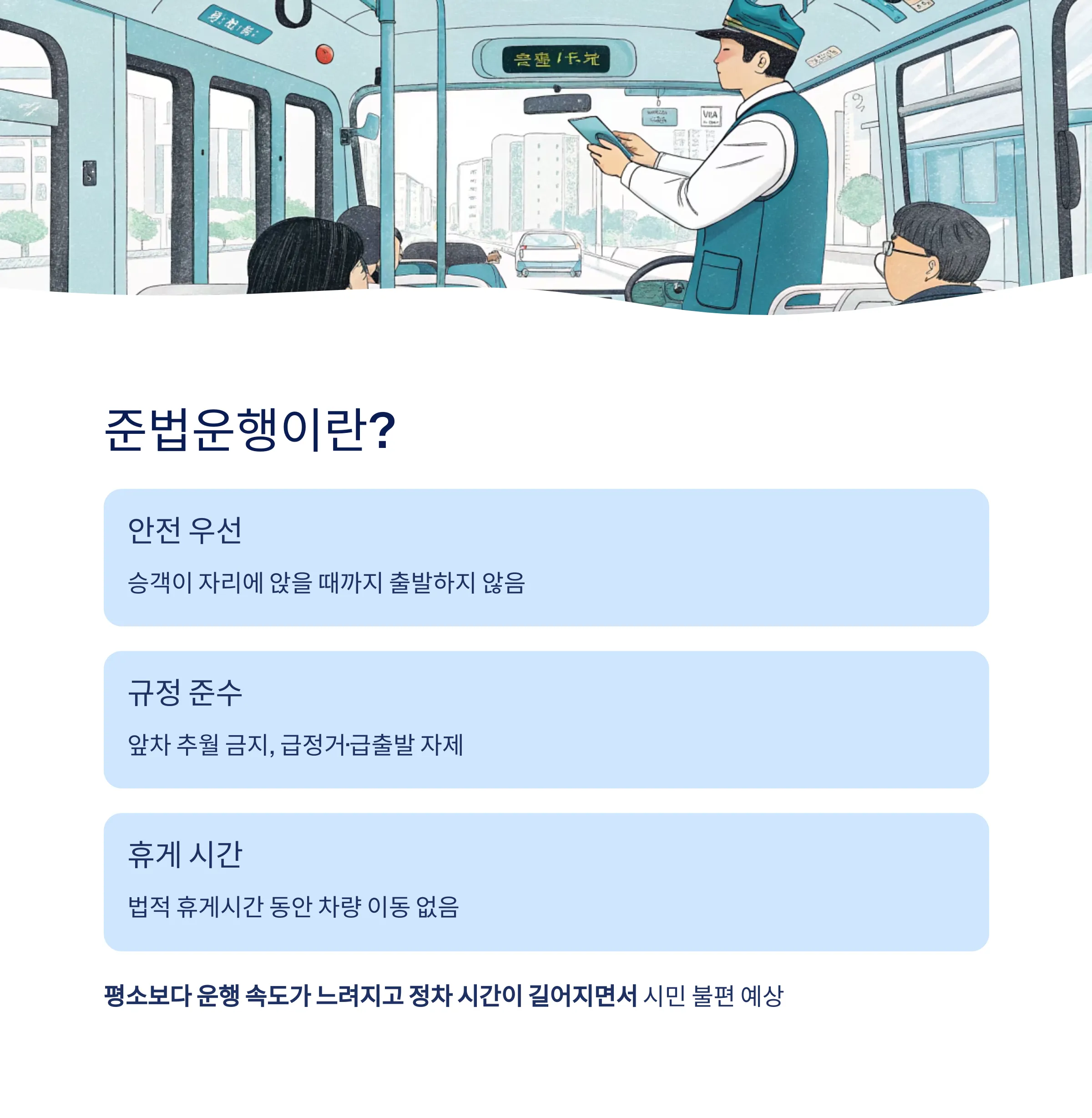 서울 시내버스의 준법운행은 말 그대로 모든 운행을 '법대로' 하는 방식입니다.