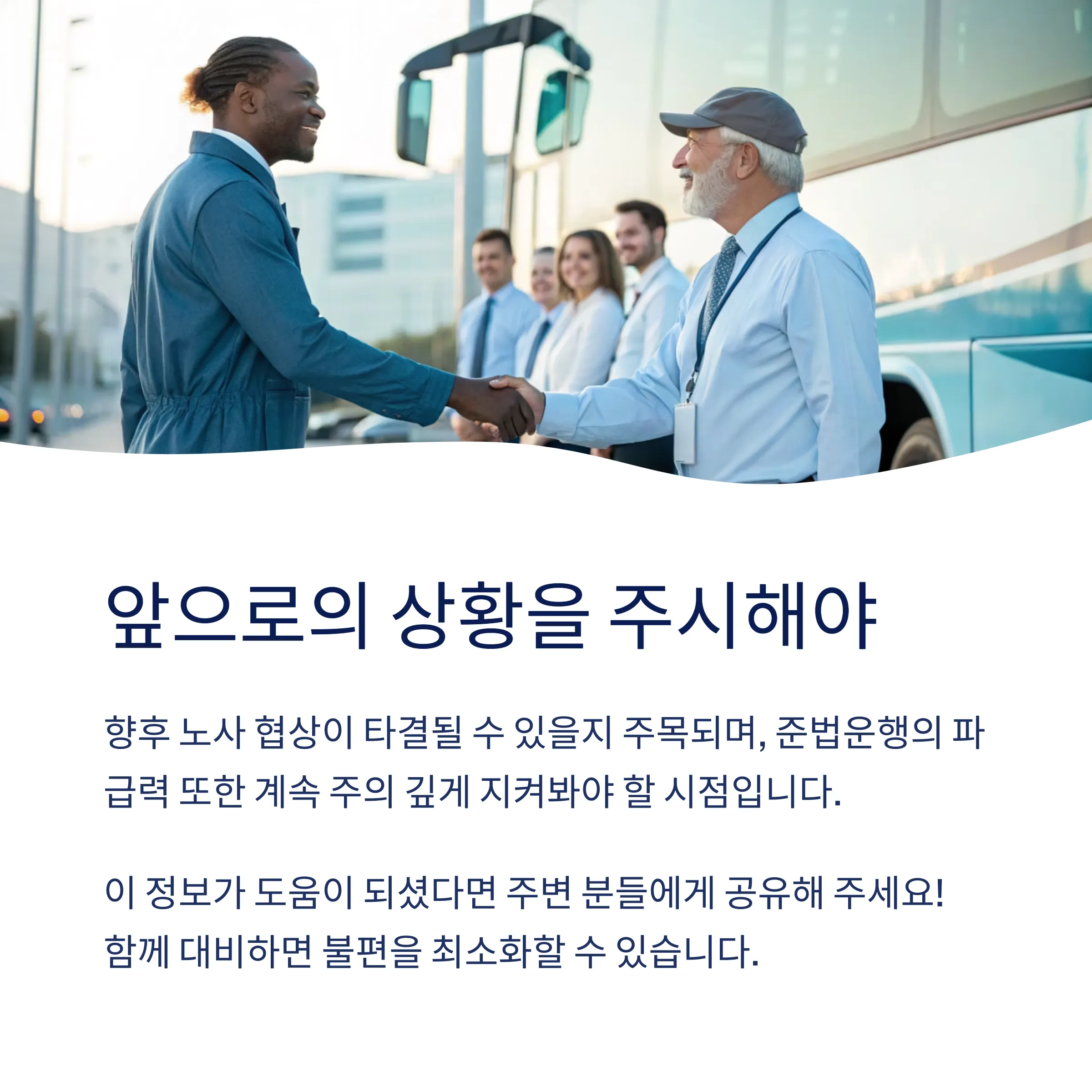 향후 노사 협상이 타결될 수 있을지 주목되며, 준법운행의 파급력 또한 계속 주의 깊게 지켜봐야 할 시점입니다.
