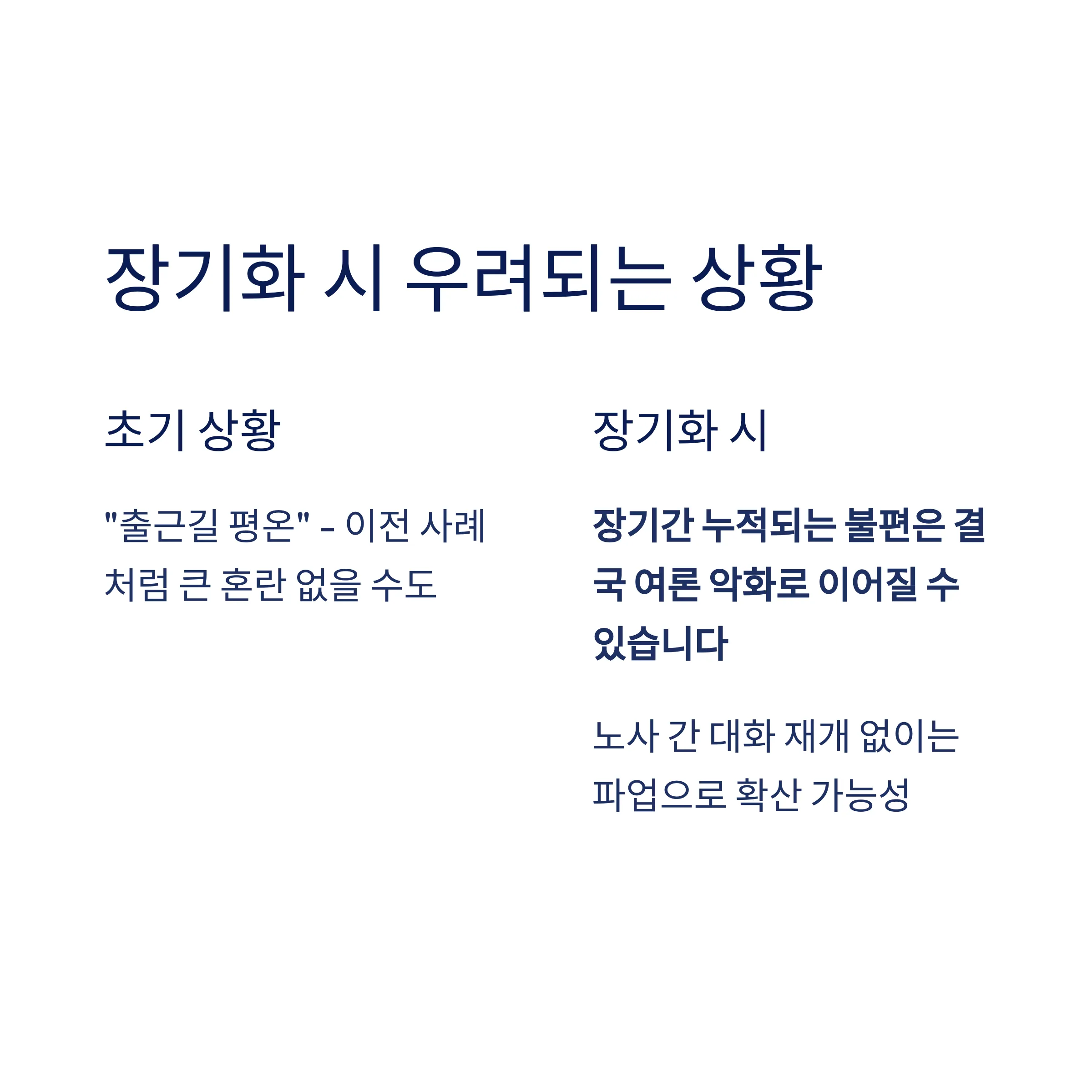 공무원 및 대체 교통 수단으로는 한계가 있으며, 장기간 누적되는 불편은 결국 여론 악화로 이어질 수 있습니다.