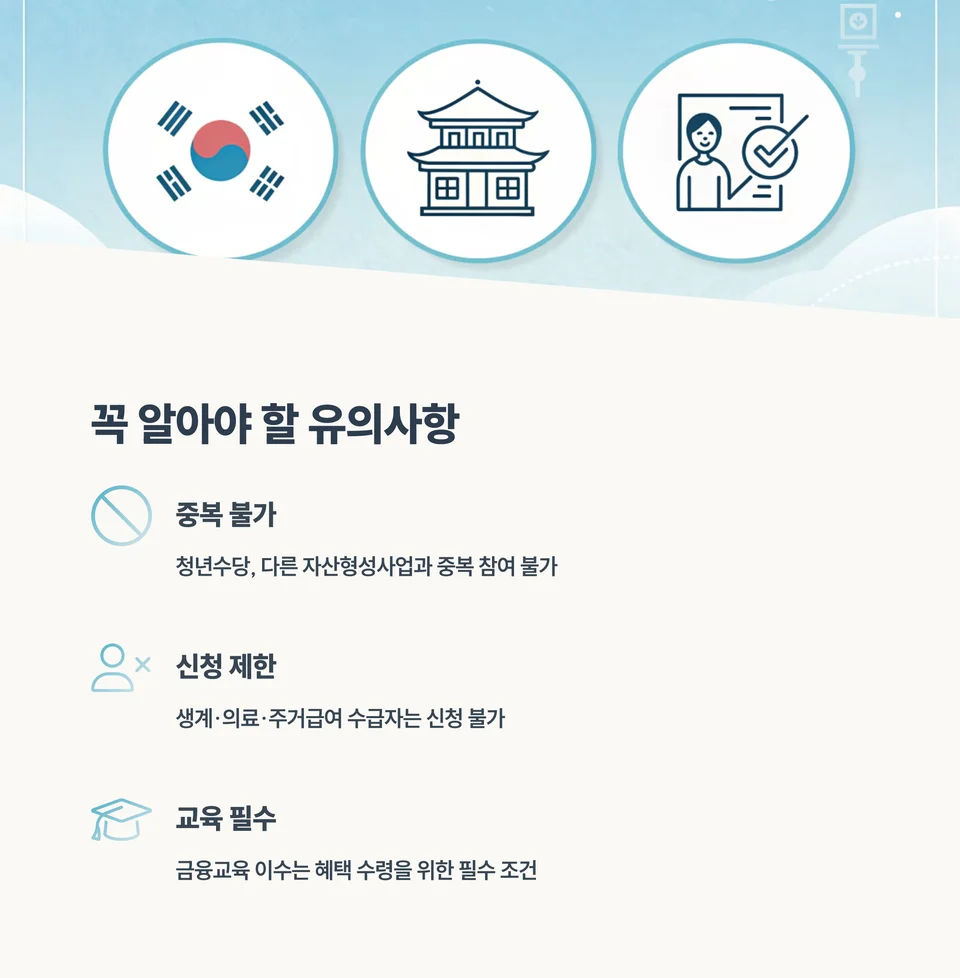 - 다른 자산형성사업(예: 희망플러스통장 등)과 중복 참여 불가