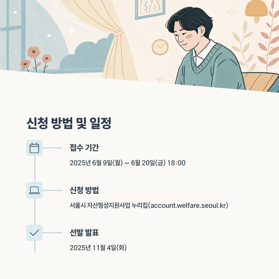 - 신청 방법: 서울시 자산형성지원사업 누리집(account.welfare.seoul.kr)