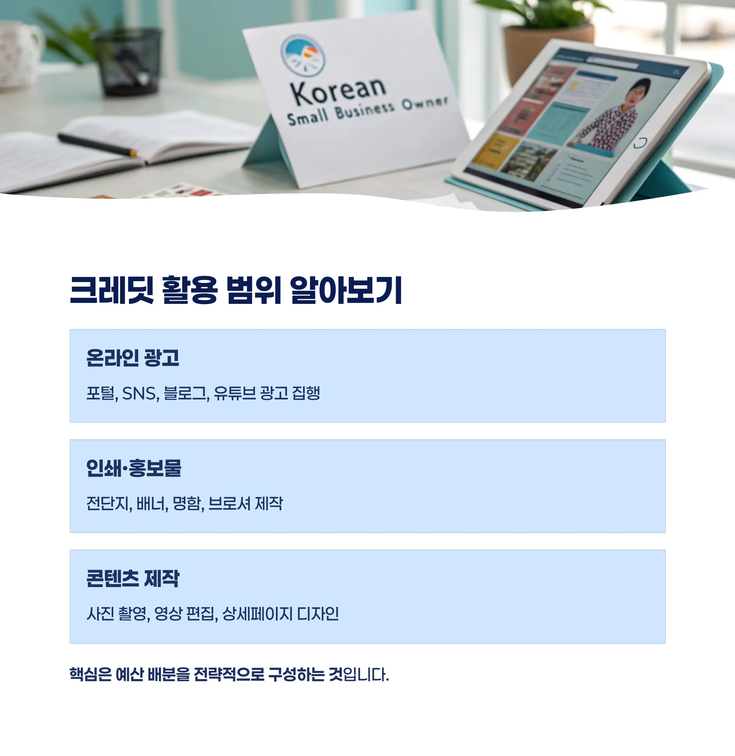 이 글에서는 소상공인 크레딧을 활용해 광고, 홍보, 마케팅에서 실제 효과를 거두는 구체적인 방법을 다루겠습니다.