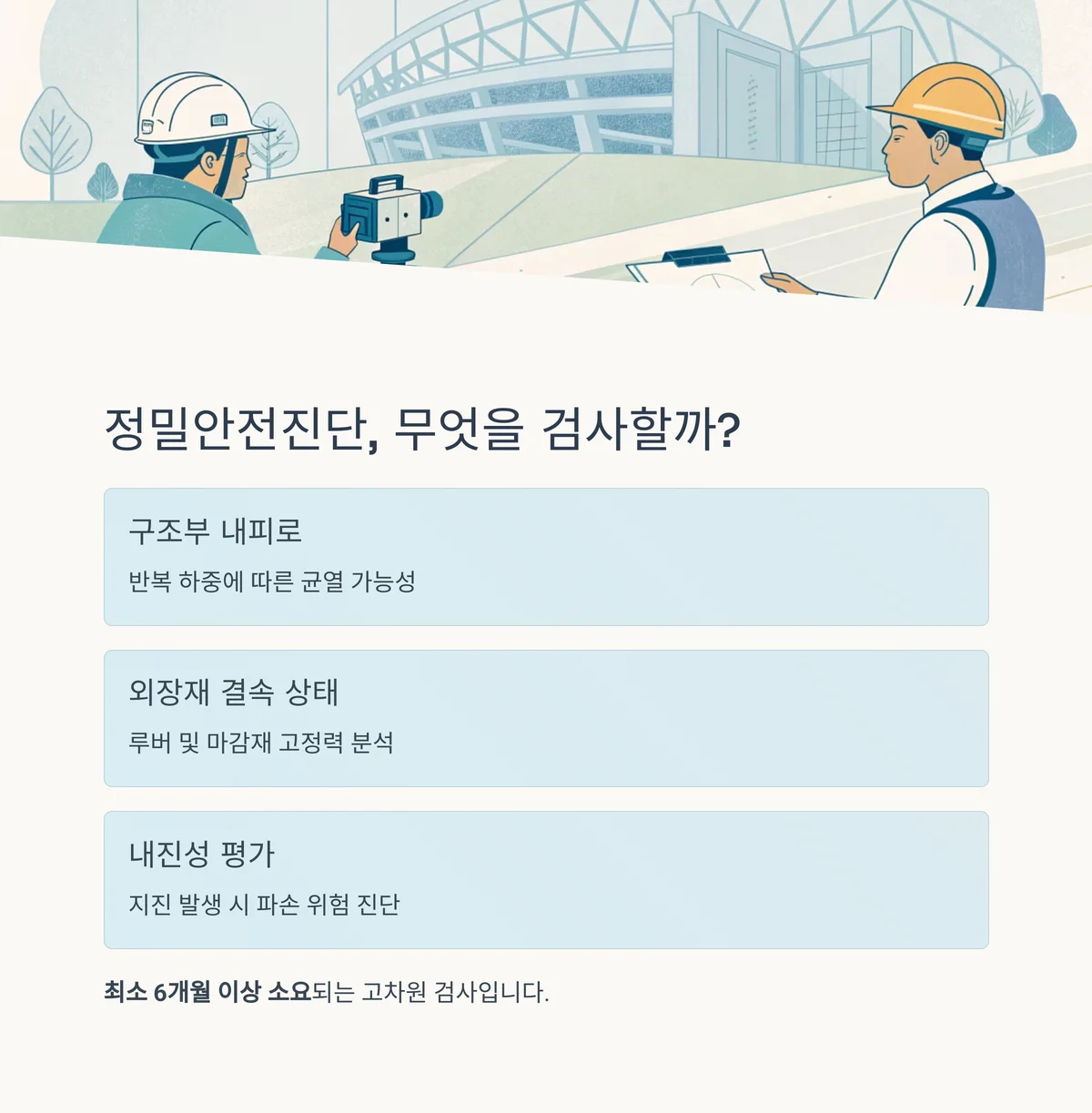 정밀안전진단은 단순한 외관 확인을 넘어 균열, 누수, 외력 대응력까지 분석하는 고차원의 검사입니다. 특히 지진이나 태풍처럼 극한 상황에서 구조물의 안전성을 평가하기 때문에 최소 6개월 이상 소요됩니다.