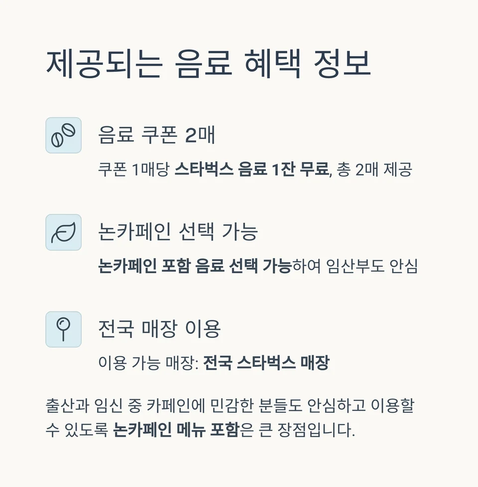 - 쿠폰 1매당 스타벅스 음료 1잔 무료, 총 2매 제공