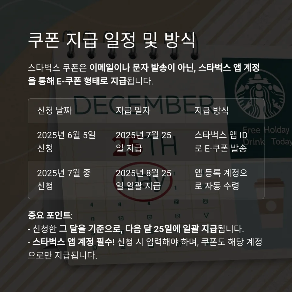 | 2025년 6월 5일 신청 | 2025년 7월 25일 지급 | 스타벅스 앱 ID로 E-쿠폰 발송 |