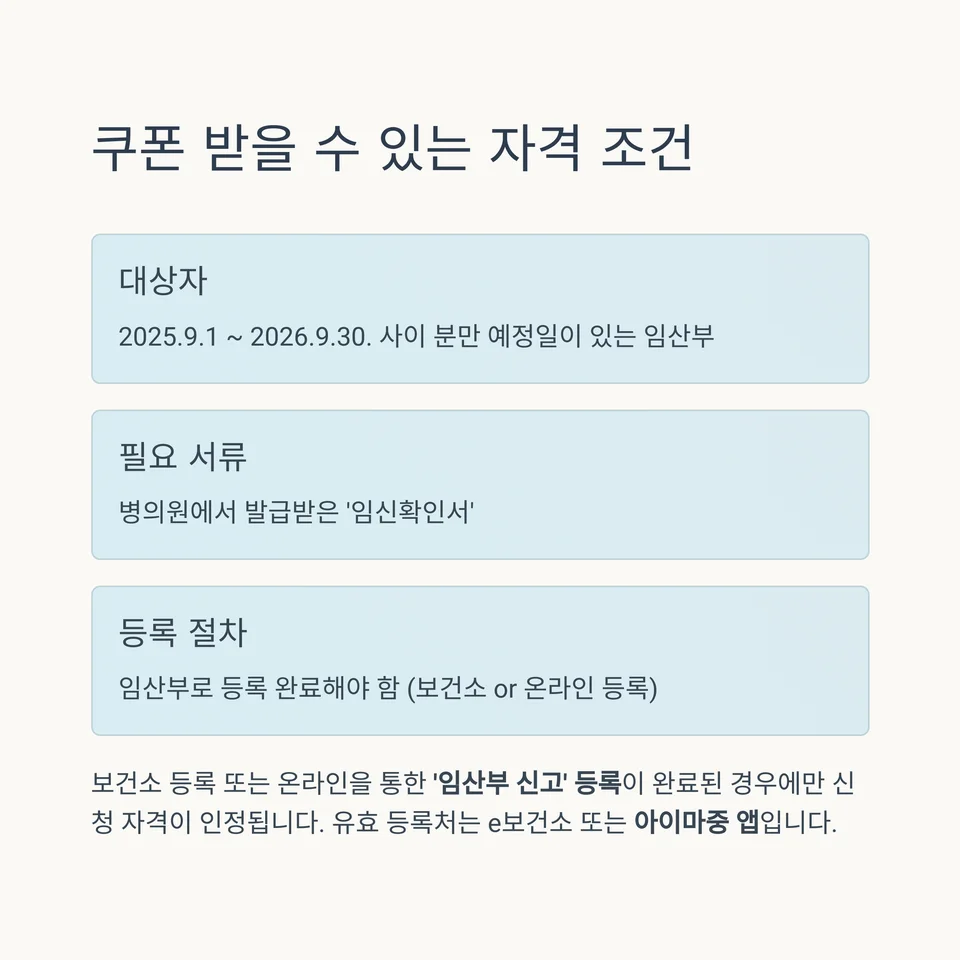 | 등록 절차 | 임산부로 등록 완료해야 함 (보건소 or 온라인 등록) |