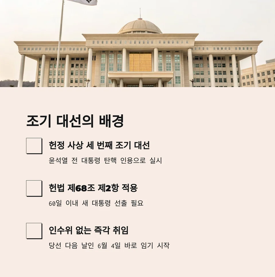 이번 조기 대선은 윤석열 전 대통령의 탄핵 인용으로 인해 치르게 되었습니다. 2025년 3월, 헌법재판소가 탄핵안을 인용하면서 대통령직은 공석이 되었고, 이에 따라 헌법 제68조 제2항에 따라 60일 이내 새 대통령을 선출해야 하는 상황이 발생했습니다.