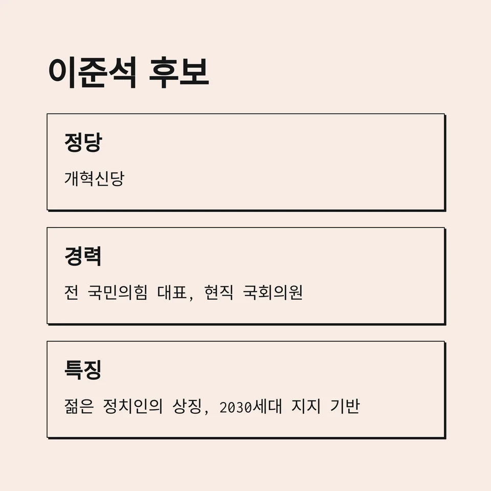 이준석 후보는 전 국민의힘 대표이자, 현재는 개혁신당을 이끌고 있는 국회의원입니다. 젊은 정치인의 상징으로, 2030세대의 지지를 바탕으로 기존 양당 체제를 비판하며 제3지대 확장을 시도하고 있습니다.
