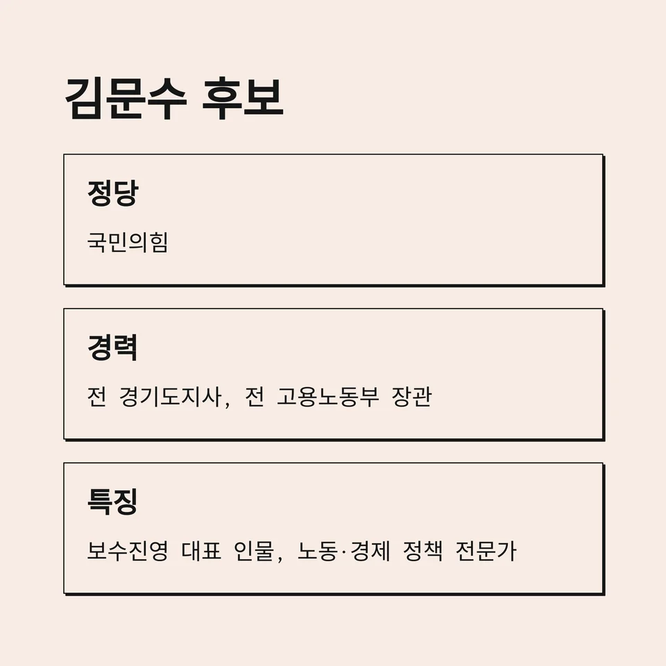 김문수 후보는 전 경기도지사이며, 고용노동부 장관을 지낸 경험이 있는 보수진영의 대표적 인물입니다. 노동 문제와 경제 정책에 정통하며, 2000년대 이후 꾸준한 정치 활동을 이어오고 있는 중진급 후보입니다.