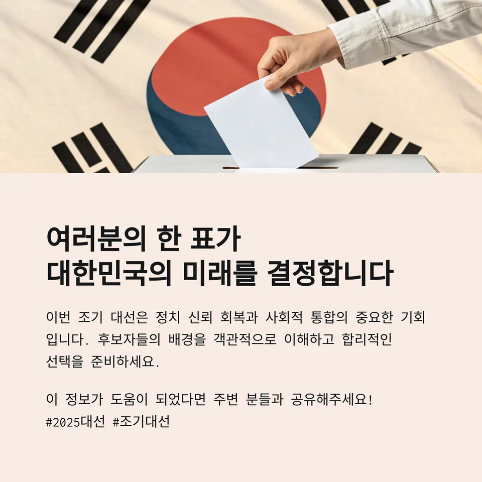 2025년 대선은 단순한 정권 교체를 넘어 정치의 신뢰 회복과 사회적 통합이라는 과제를 안고 있습니다. 특히 조기 대선이라는 특수성 속에서, 국민 한 사람 한 사람의 참여가 그 어느 때보다 중요합니다.