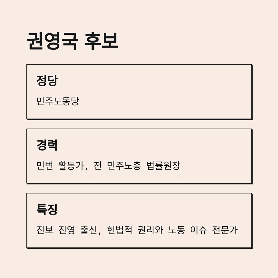 권영국 후보는 민주사회를 위한 변호사모임 활동과 민주노총 법률원장을 지낸 진보 진영 출신 인사입니다. 헌법적 권리와 노동 이슈에 천착해 온 인물로, 진보 정당의 통합적 후보로서 상징성이 큽니다.
