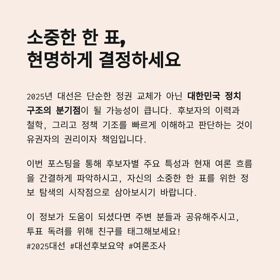 2025년 대선은 단순한 정권 교체가 아닌 대한민국 정치 구조의 분기점이 될 가능성이 큽니다.
