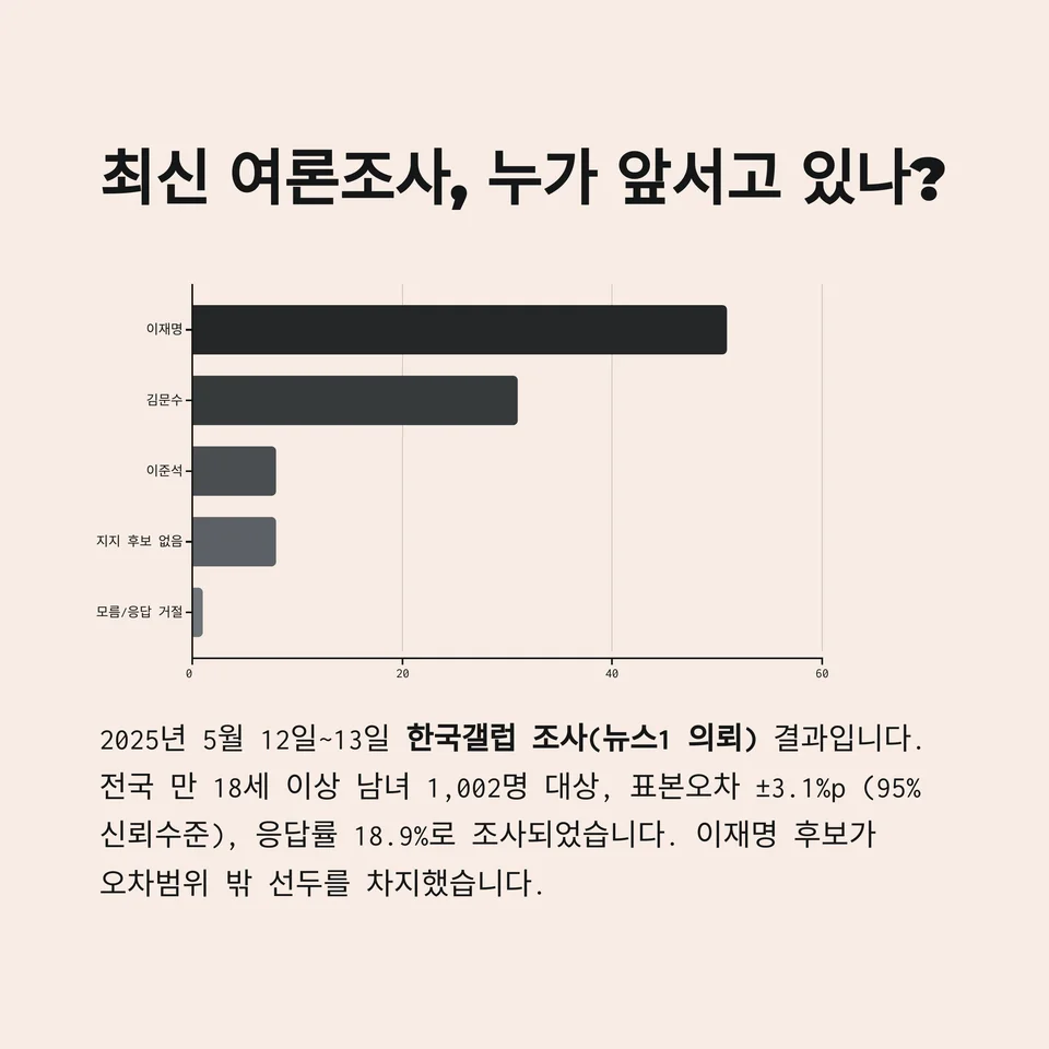 "이 조사는 제21대 대선 후보군이 확정된 이후 발표된 자료로, 이재명 후보가 오차범위 밖 선두를 차지한 것이 특징입니다."