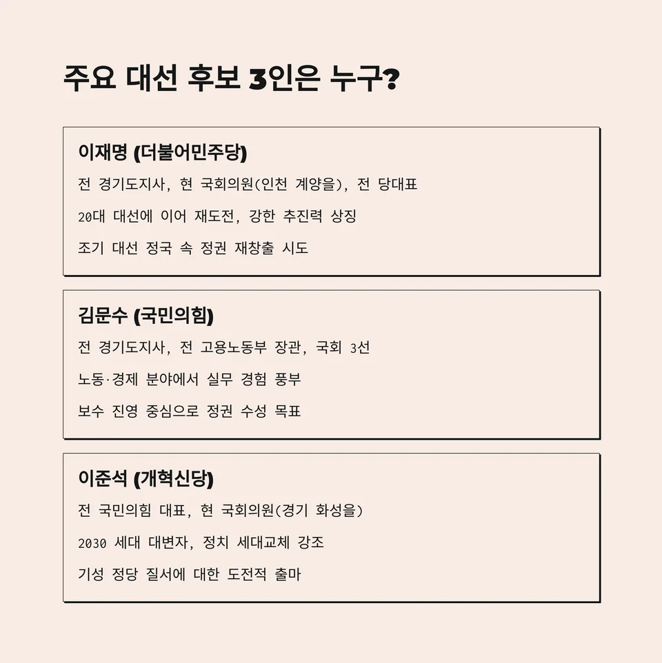 | 이재명 (더불어민주당) | 전 경기도지사, 현 국회의원(인천 계양을), 전 당대표 | 20대 대선에 이어 재도전, 강한 추진력 상징 | 조기 대선 정국 속 정권 재창출 시도 |