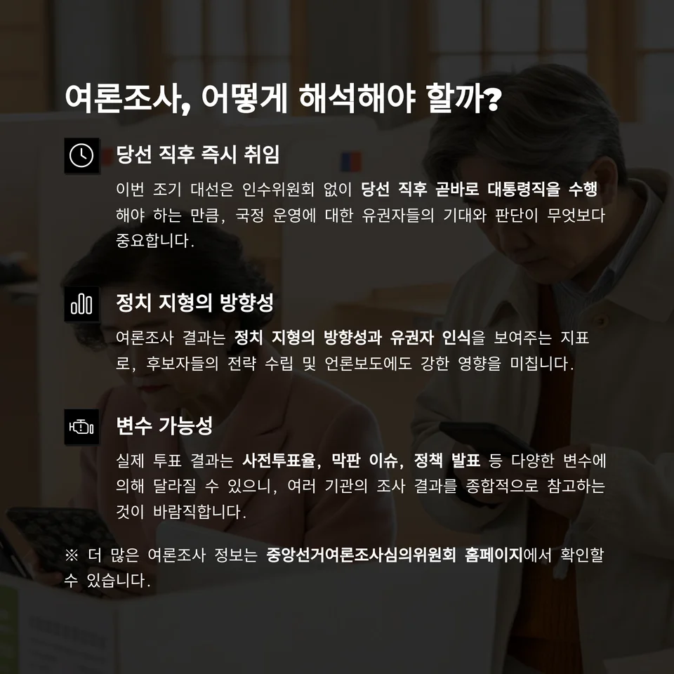 하지만 여론조사는 어디까지나 "그 시점의 민심"일 뿐입니다. 실제 투표 결과는 사전투표율, 막판 이슈, 정책 발표 등 다양한 변수에 의해 달라질 수 있으니,