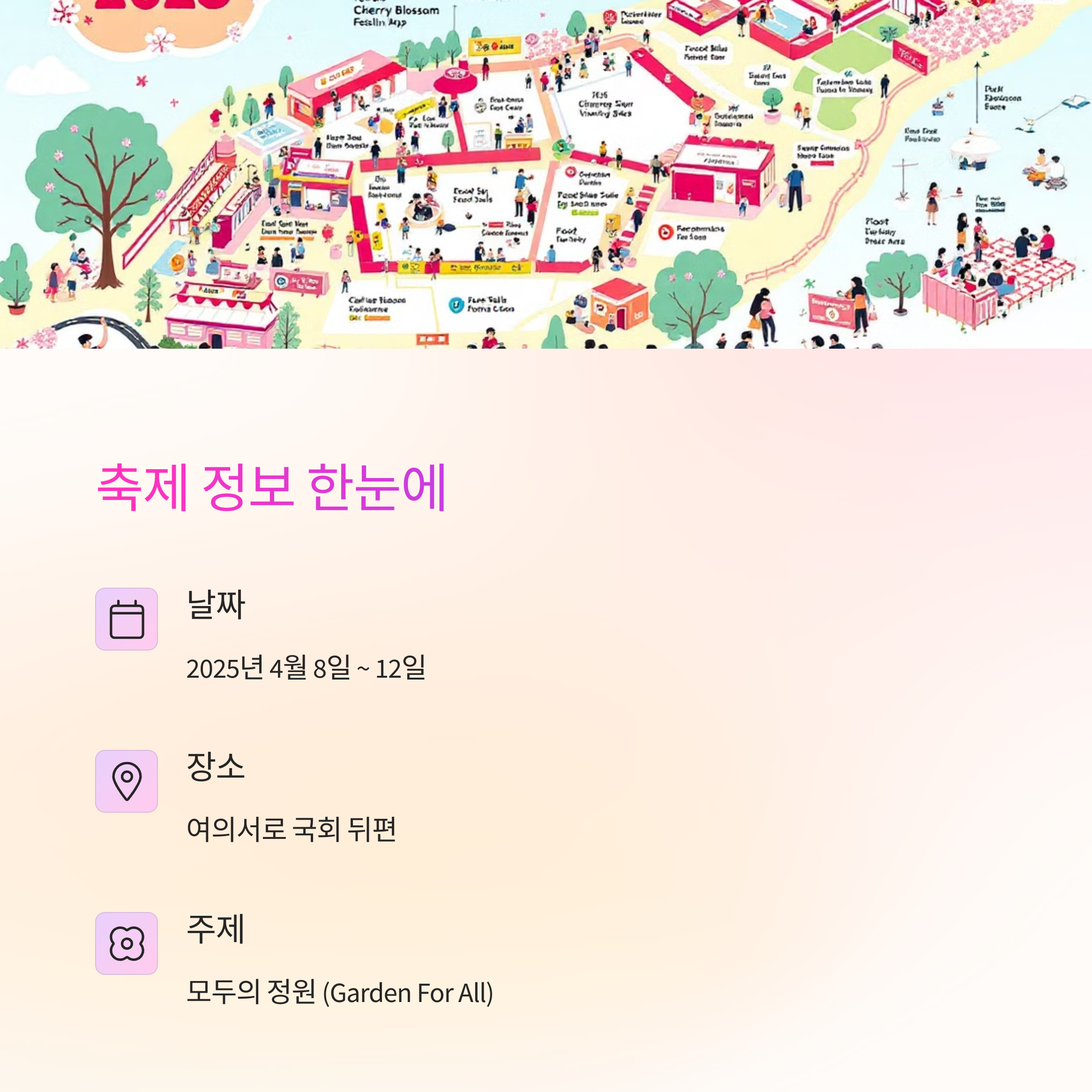 | 2025년 4월 8일~12일, 여의서로 일대에서 진행 | 대중교통 이용 필수, 도로 통제 예정 | 봄꽃, 예술, 미식, 휴식으로 구성된 테마 공간 |