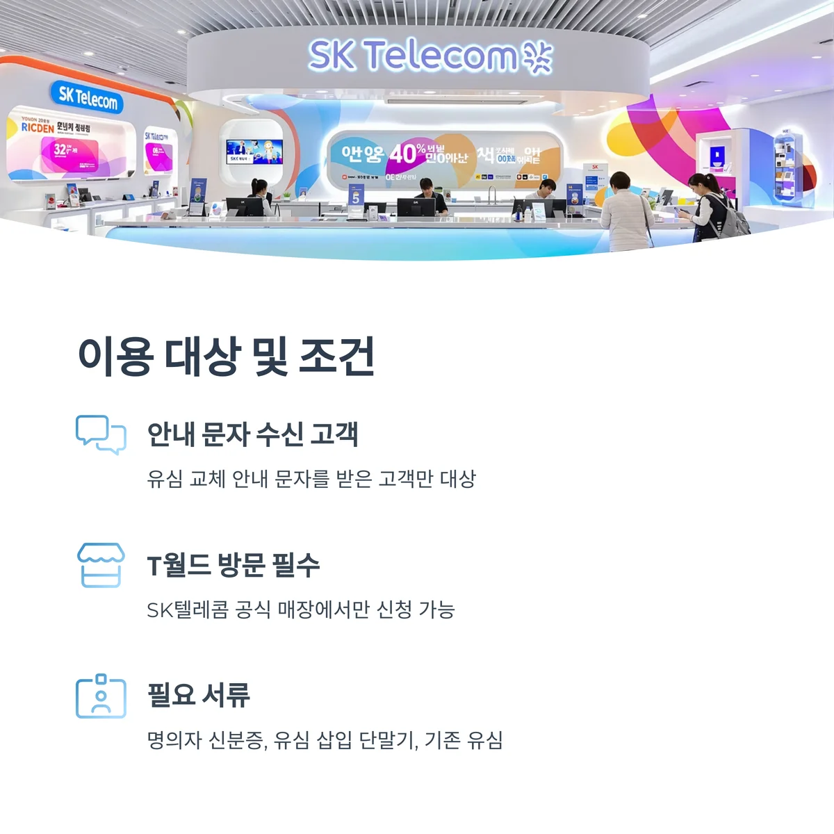 유심 교체 안내 문자를 받은 고객이 대상이며, SK텔레콤의 공식 매장인 T월드 지점에서만 신청이 가능합니다.