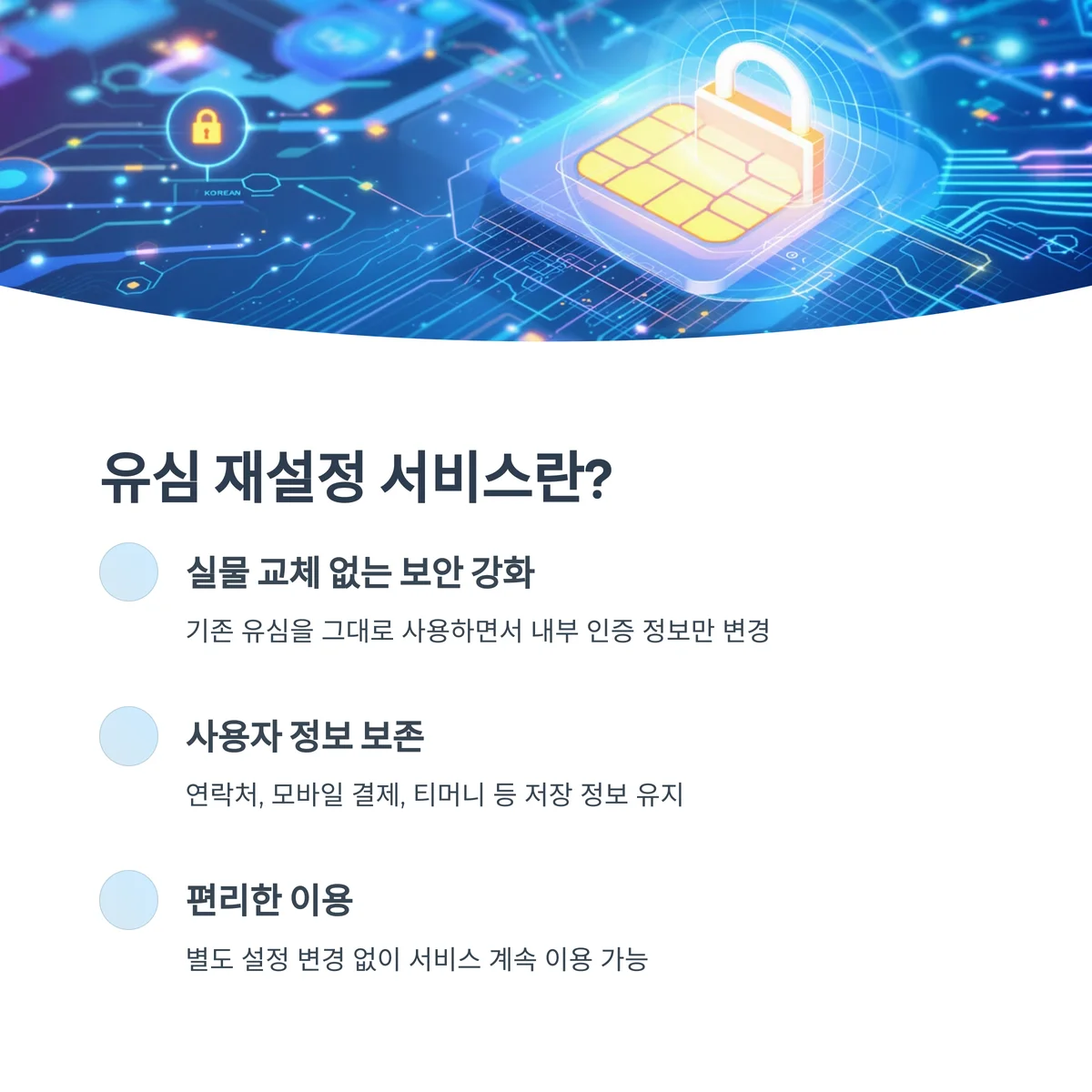 SK텔레콤의 유심 재설정은 실물 유심칩을 그대로 유지한 채, 내부의 사용자 인증 정보를 변경하여 보안을 강화하는 기술입니다.