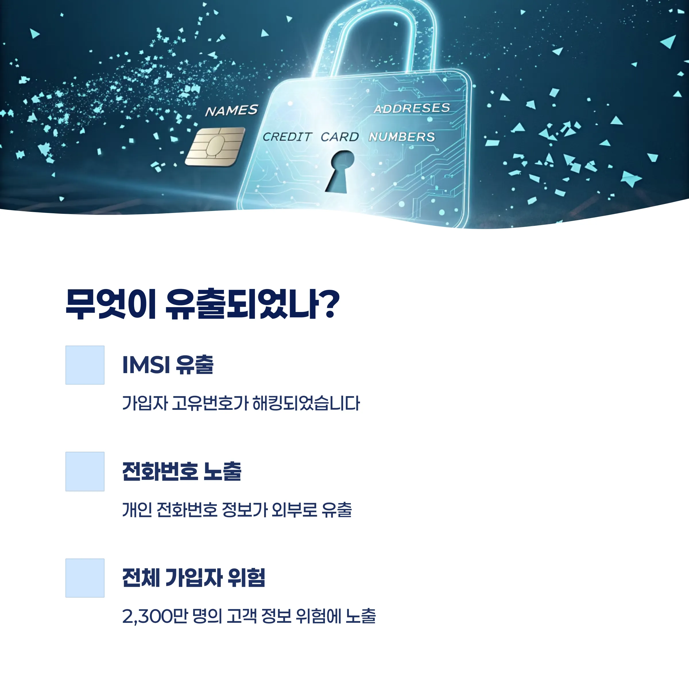 다행히 IMEI와 같은 단말기 고유번호는 유출되지 않았지만, 전체 가입자 2,300만 명이 위험에 노출됐습니다.