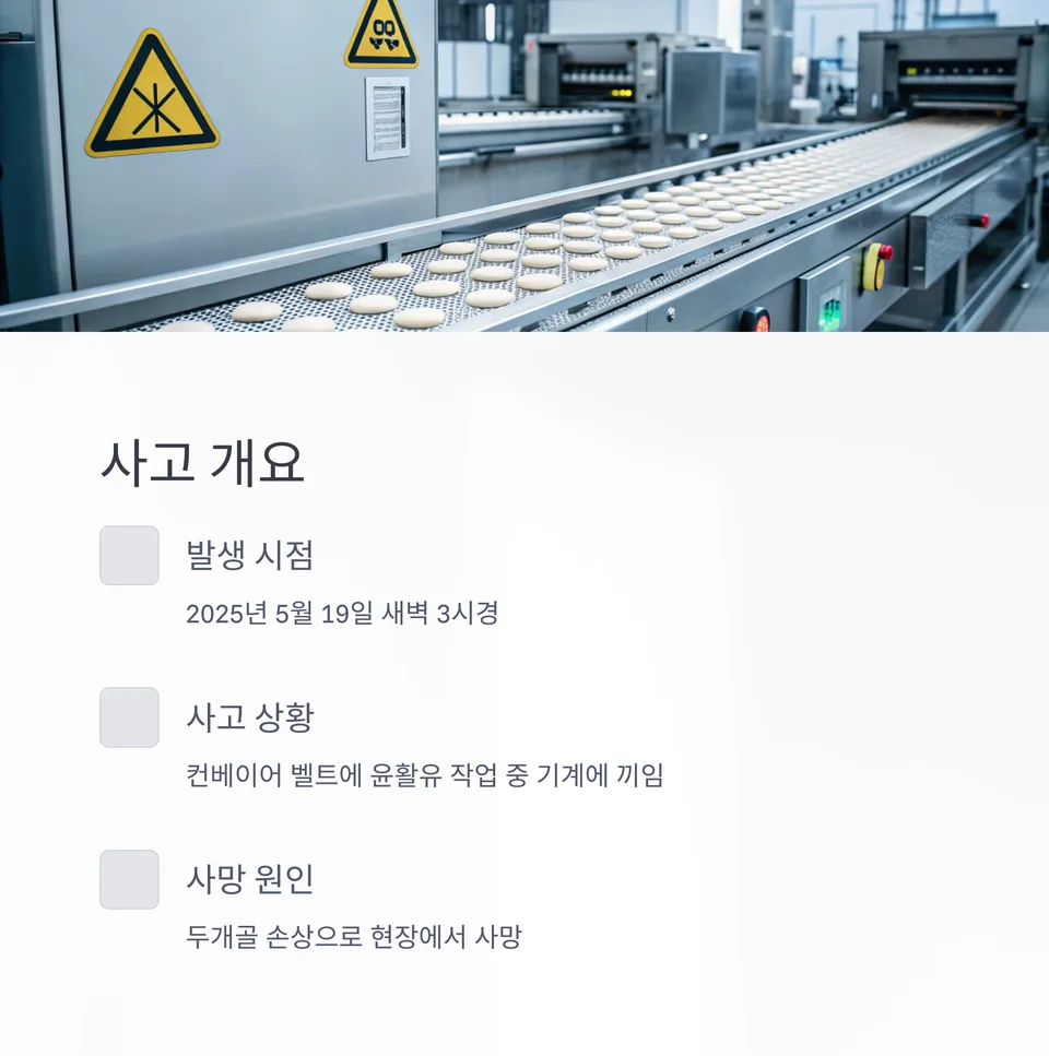 | 2025년 5월 | 컨베이어 벨트에 끼어 사망 | 시흥 SPC삼립 공장 |