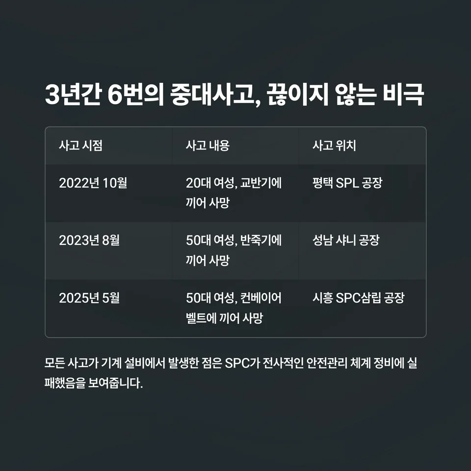 이번 시화공장 사고는 SPC 계열사 내 최근 3년간 여섯 번째 중대사고입니다.